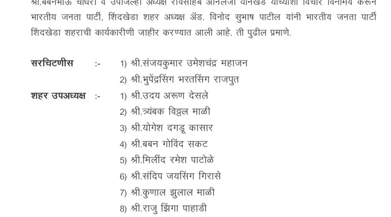 भारतीय जनता पार्टी शिंदखेडा शहराची जंबो कार्यकारणी जाहिर.