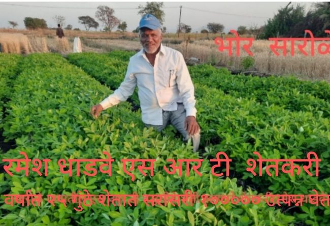 सारोळे : भोर तालुक्यातील पूर्व भागातील पुणे सातारा महामार्ग लगत सारोळे गावातील शेतकरी रमेश लक्ष्मण धाडवे यांनी शून्य मशागत या तंत्रामध्ये सुरुवातीलाच गादीवाफेवर पिकांची लागवड करून जास्तीत जास्त उत्पन्न काढले. यासाठी त्यांना एस आर टी कृषी सन्मान सोहळा २०२४ या कार्यक्रमात एस आर टी शून्य मशागत पद्धत वापरून जास्तीत जास्त उत्पन्न घेतल्याबद्दल त्यांची दि.२२ मे रोजी पुरस्कारासाठी निवड झाली आहे.