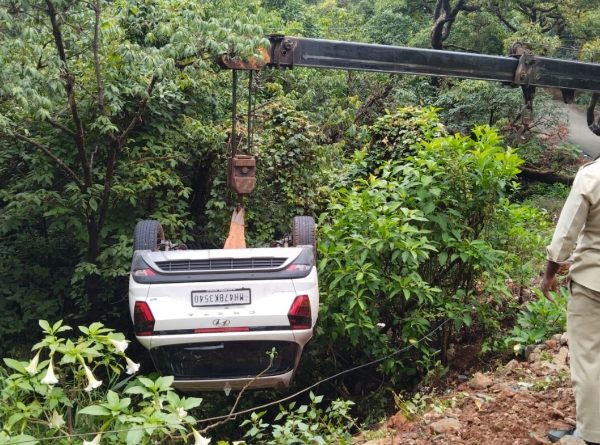महाबळेश्वर तापोळा रोडवरील भारत हॉटेल जवळील दाट धुक्याचा अंदाज न आल्याने हुंडाई क्रेटा कार थेट अंदाजे २० फुट दरीत कोसळली. सुदैवाने कोणतिही जिवीत हानी झाली नाही..मोटारीतील चालक व इतर प्रवासी सुखरूप बचावले. ही घटना मंगळवारी सायंकाळी ६ .३० दरम्यान घडली. पाऊस व दाट धुके असल्याने भारत हॉटेल पुढे महाबळेश्वर कडे येत असताना वळणाचा अंदाज न आल्यामुळे सदरची घटना घडली. वाहन दरीत कोसळून पलटी झाले सुदैवाने चालक रमेश सांळुखे रा. इस्लामपुर यांच्या सह एक पुरुष, दोन महिला व तीन लहान मुले होती. सदर वाहन क्र एम् एच् ४७ बी के ३५४० हुंडाई क्रेटा कंपनीचे आहे. सदर वाहन क्रेनच्या साह्याने बाहेर काढण्यात आले. या मदत कार्यात महाबळेश्वर पोलीस स्टेशनचे पोलीस जितेंद्र कांबळे व सलिम सय्यद यांचे मोलाचे सहकार्य लाभले.