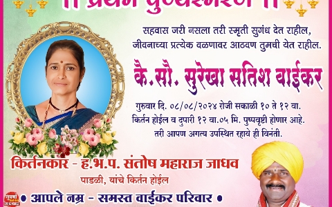 कै/ सौ सुरेखा सतीश वाईकर त्यांच्या प्रथम पुण्यस्मरण निमित्त ह भ प संतोष महाराज जाधव यांचे कीर्तन