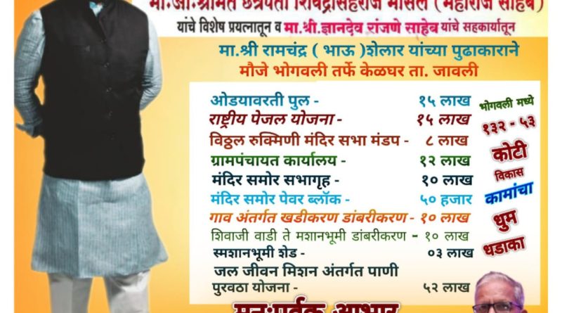 सर्व सामान्यांचे जनतेचे प्रश्न जाणून घेणारे मा. आ. श्रीमं छत्रपती शिवेंद्रसिंहराजे भोसले ( महाराज साहेब ) यांच्या निधीतून व मा. ज्ञानदेव रांजणे साहेब यांच्या सहकार्यातून व महाराज साहेबांचे कट्टर समर्थक मा. रामभाऊ शेलार यांच्या पुढाकाराने मौजे भोगवली तर्फे केळघर ता. जावली गावामध्ये १ कोटी ३२ लाख ५३ हजार रु. विकास कामांचा उंचाक ओडयावरती पुल १५ लाख , राष्ट्रीय पेजल योजना १५ लाख , विठ्ठल रुक्मिणी मंदिर सभा मंडप ८ लाख , ग्रामपंचायत कार्यालय १२ लाख , मंदिर समोर सभागृह १० लाख , मंदिर समोर पेवर ब्लॉक ५० हजार , गाव अंर्तगत खडीकर व डांबरीकरण १० लाख , शिवाजी वाडी ते मशानभूमी डांबरीकरण १० लाख , मशानभूमी शेड ०३ लाख , जल जीवन मिशन अंतर्गत पाणी पुरवठा योजना ५२ लाख .