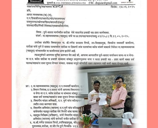 दि. 20भोर :-सातारा ते पुणे या मार्गावर प्रवास करणाऱ्या एसटी गाड्यांना आता सारोळे (ता. भोर) येथे अधिकृत थांबा देण्यात आला आहे. महाराष्ट्र राज्य मार्ग परिवहन महामंडळ, पुणे विभागाच्या दिनांक १७ जून २०२५ रोजीच्या पत्राद्वारे हा निर्णय घोषित करण्यात आला आहे. शिंदे गट शिवसेनेचे उपजिल्हाप्रमुख गणेश शरदराव निगडे यांच्या सातत्यपूर्ण पाठपुराव्यामुळे ही मागणी मान्य करण्यात आली आहे. त्यांनी महाराष्ट्र राज्याचे परिवहन मंत्री नामदार प्रतापजी सरनाईक यांना ही मागणी केली होती. त्यास अनुसरून पुणे विभाग नियंत्रक अरुणजी सिया यांनी सखोल विचार करून ही सेवा सुरू करण्यास मंजुरी दिली आहे.